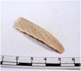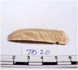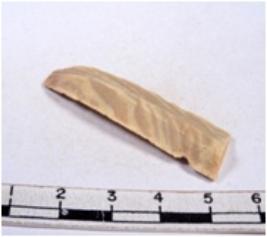 | Description / विवरण | A fragment of a rectangular shaped chert blade showing dorsal sides with sharp edges having smooth surface and triangular section. |