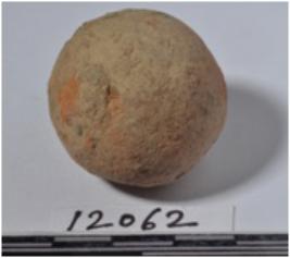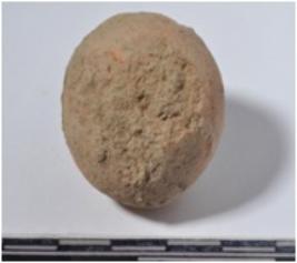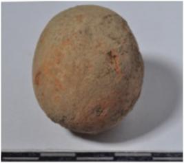 | Description / विवरण | A stone ball round in shape, slightly broken from one side of rough surface. |