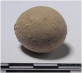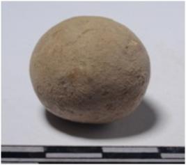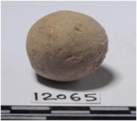 | Description / विवरण | A terracotta sling ball, round in shape of smooth surface. |