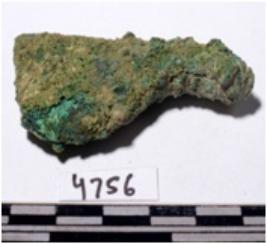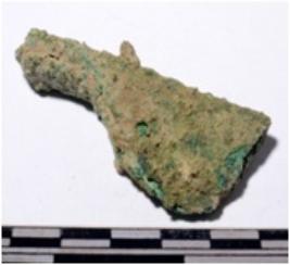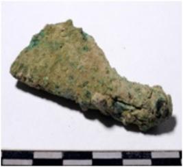 | Description / विवरण | A fragment of a copper knife sharpen from one side slightly curved handle of rough surface. |