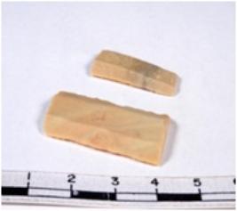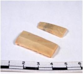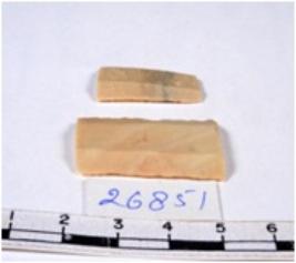 | Description / विवरण | A fragment of a rectangular shaped chert blade showing dorsal sides with sharp cutting edges having smooth surface and triangular section. |