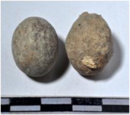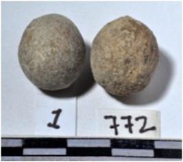 | Description / विवरण | A terracotta sling ball, round in shape of rough surface. |