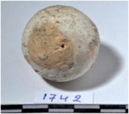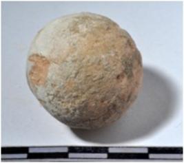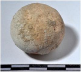 | Description / विवरण | A terracotta sling ball round in shape of smooth surface. |
