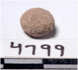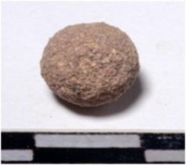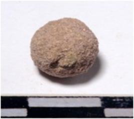 | Description / विवरण | A terracotta sling ball round in shape of rough surface. |