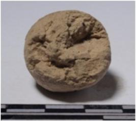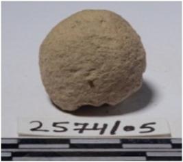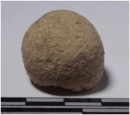 | Description / विवरण | A terracotta sling ball, round in shape, slightly chipped off surface of smooth surface. |