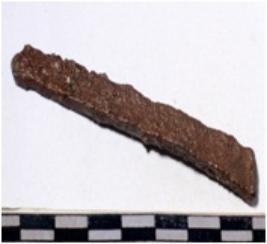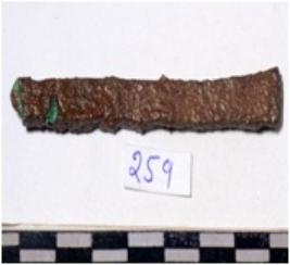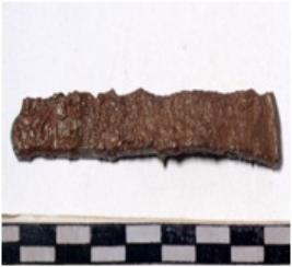 | Description / विवरण | A fragment of a copper chisel slightly curved on top, of rough surface. |