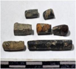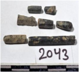 | Description / विवरण | Fragments of stone drill bits, circular in section broken from both ends of rough surface. |