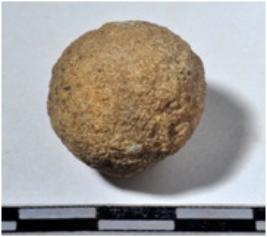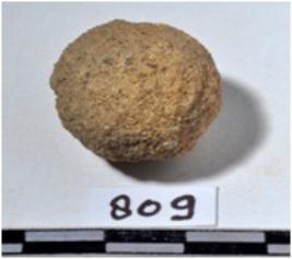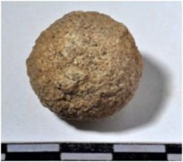 | Description / विवरण | A terracotta sling ball, round in shape of rough surface. |