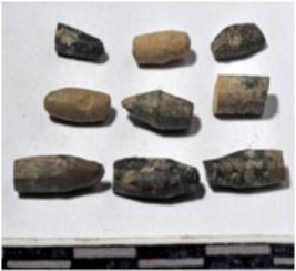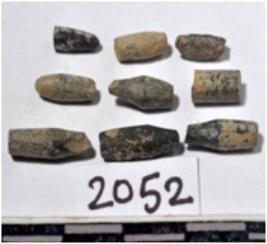 | Description / विवरण | Fragments of stone drill bits, circular in section, broken from both ends of rough surface. |