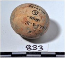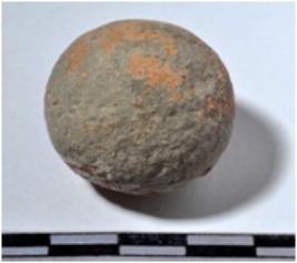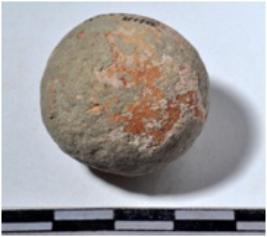 | Description / विवरण | A terracotta sling ball, round in shape of smooth surface. |