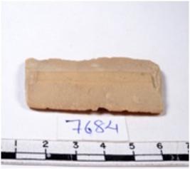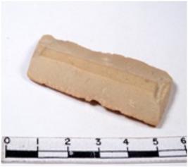 | Description / विवरण | A fragment of a rectangular shaped chert blade showing dorsal sides with sharp cutting edges having smooth surface and triangular section. |