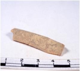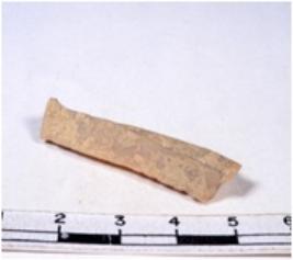 | Description / विवरण | A fragment of a rectangular shaped chert blade showing dorsal sides with sharp cutting edges having smooth surface and triangular section. |