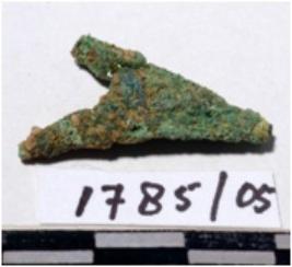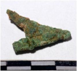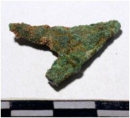 | Description / विवरण | A fragment of a copper arrow head, triangular shaped, pointed one end of rough surface. |