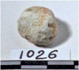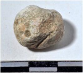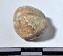 | Description / विवरण | A terracotta sling ball, uneven in shape of rough surface. |