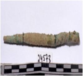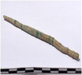 | Description / विवरण | A fragment of a mended copper rod, broken one end, pointed other end, circular in section of rough surface. |