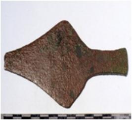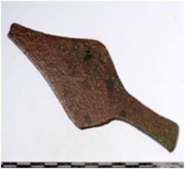 | Description / विवरण | A copper spear head spear shaped pointed on one end of smooth surface. |