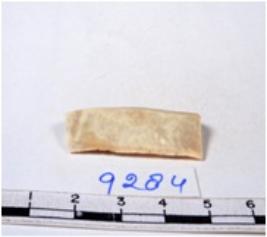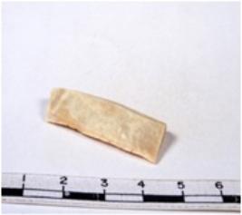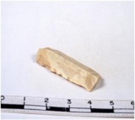 | Description / विवरण | A fragment of a rectangular shaped chert blade showing dorsal sides with sharp cutting edges having smooth surface and triangular section. |