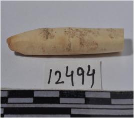 | Description / विवरण | A fragment of a bone point having pointed one side, circular in section of smooth surface. |
