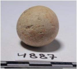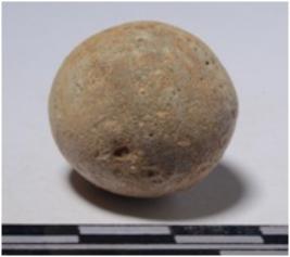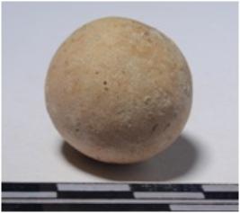 | Description / विवरण | A terracotta sling ball, round in shape of smooth surface. |