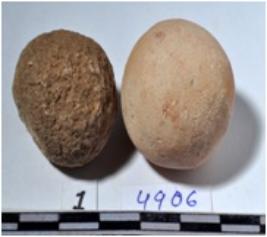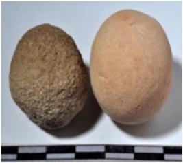 | Description / विवरण | A terracotta sling ball round in shape of rough surface. |