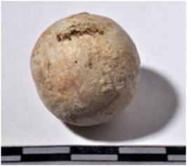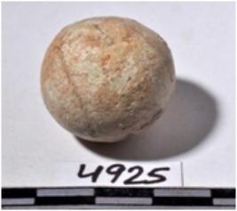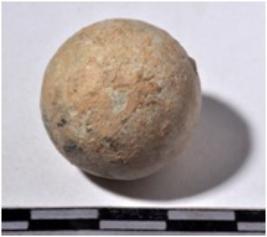 | Description / विवरण | A terracotta sling ball, round in shape of smooth surface. |