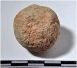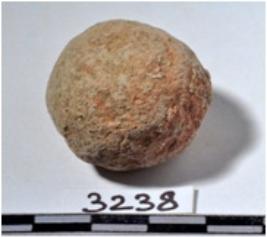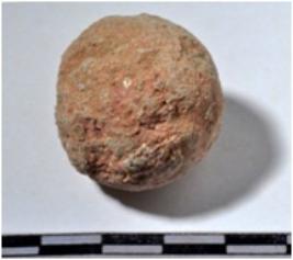 | Description / विवरण | A terracotta sling ball, round in shape of rough surface. |