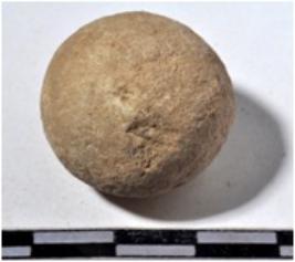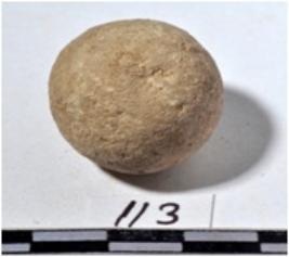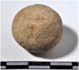 | Description / विवरण | A terracotta sling ball round in shape of rough surface. |