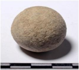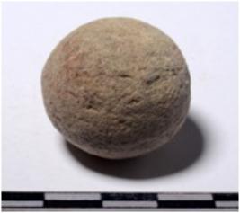 | Description / विवरण | A terracotta sling ball, round in shape of rough surface. |