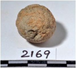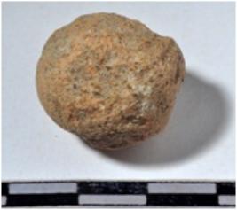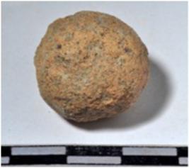 | Description / विवरण | A terracotta sling ball round in shape of rough surface. |