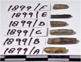 | Description / विवरण | Fragments of stone drill bits, circular in section, broken from both end of smooth surface. |