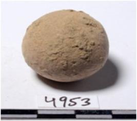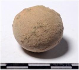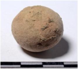 | Description / विवरण | A terracotta sling ball round in shape of rough surface. |