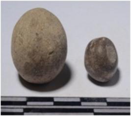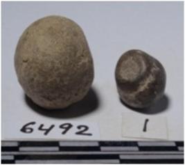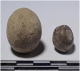| Description / विवरण | A terracotta sling ball, round in shape of rough surface. |