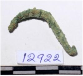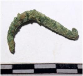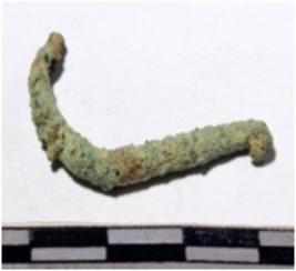 | Description / विवरण | A fragment of a fish hook curved shaped having one end pointed of rough surface. |