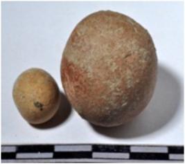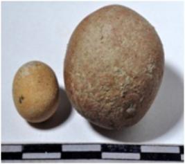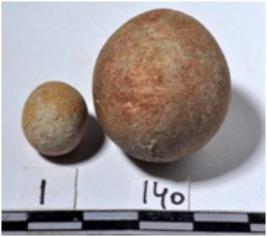 | Description / विवरण | A terracotta sling ball round in shape of rough surface. |
