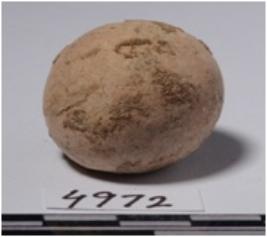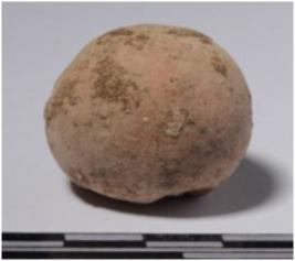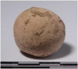 | Description / विवरण | A terracotta sling ball round in shape of rough surface. |