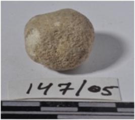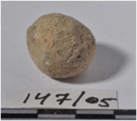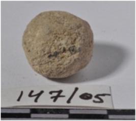 | Description / विवरण | A terracotta sling ball, round in shape of rough surface. |