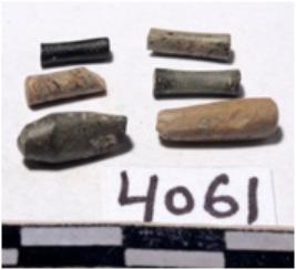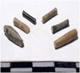 | Description / विवरण | Fragments of stone drill bits, circular in section, broken from both ends of smooth surface. |