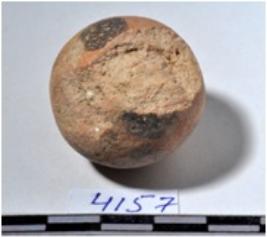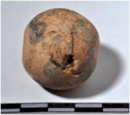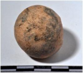 | Description / विवरण | A terracotta sling ball round in shape of smooth surface. |