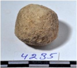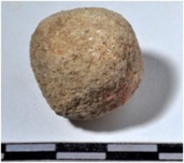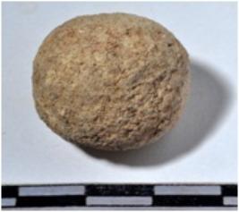 | Description / विवरण | A terracotta sling ball round in shape of rough surface. |