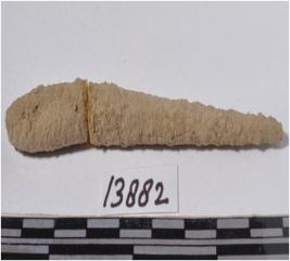 | Description / विवरण | A fragment of a bone point having pointed one side, circular in section of rough surface. |