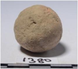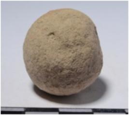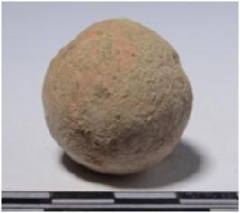 | Description / विवरण | A terracotta sling ball, round in shape of rough surface. |