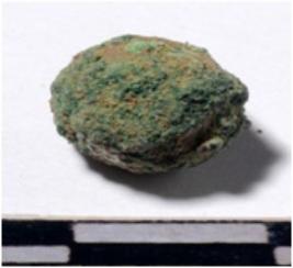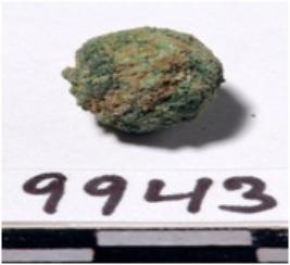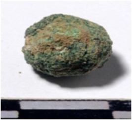 | Description / विवरण | A copper sling ball, round in shape of rough surface. |
