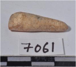 | Description / विवरण | A fragment of a bone point, pointed at one side, circular in section and smooth surface. |