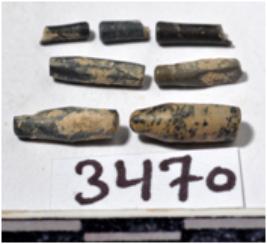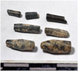 | Description / विवरण | Fragments of stone drill bits, circular in section, broken from both ends of smooth surface. |