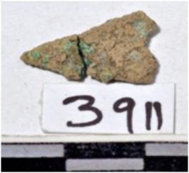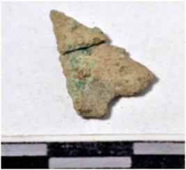| Description / विवरण | A fragment of a copper arrow head triangular in shape pointed at one end of rough surface. |