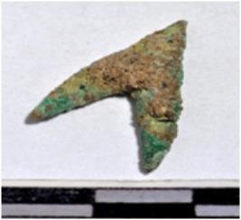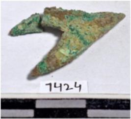 | Description / विवरण | A fragment of a copper triangular shaped arrow head, having pointed one end of rough surface. |