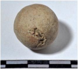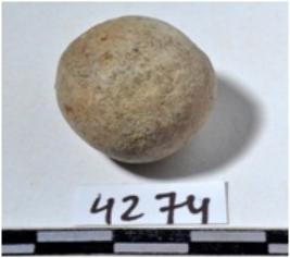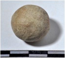 | Description / विवरण | A terracotta sling ball, round in shape of rough surface. |