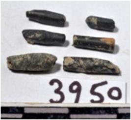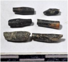 | Description / विवरण | Fragments of stone drill bits, circular in section, broken from both ends of rough surface. |