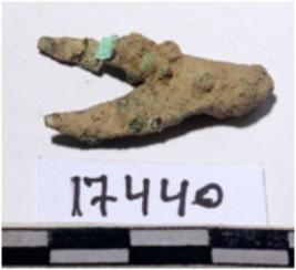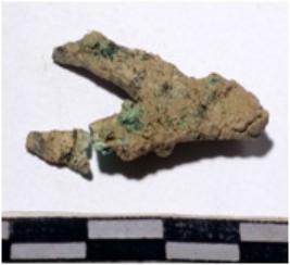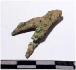 | Description / विवरण | A fragment of a copper triangular shaped arrow head, pointed one end of rough surface. |