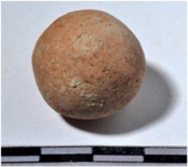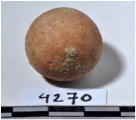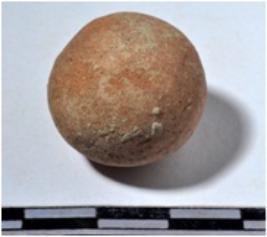 | Description / विवरण | A fragment of a terracotta sling ball, round in shape of rough surface. |